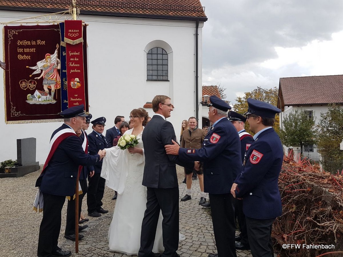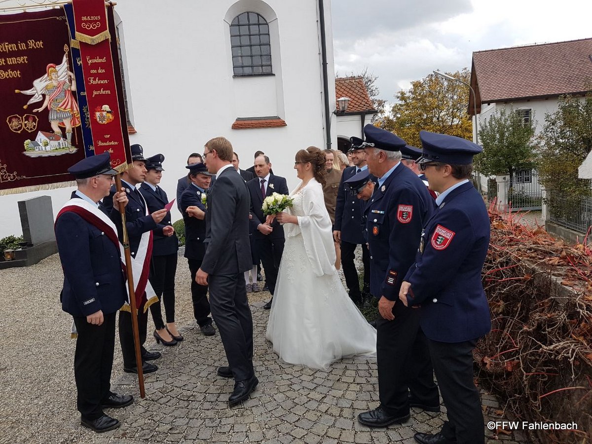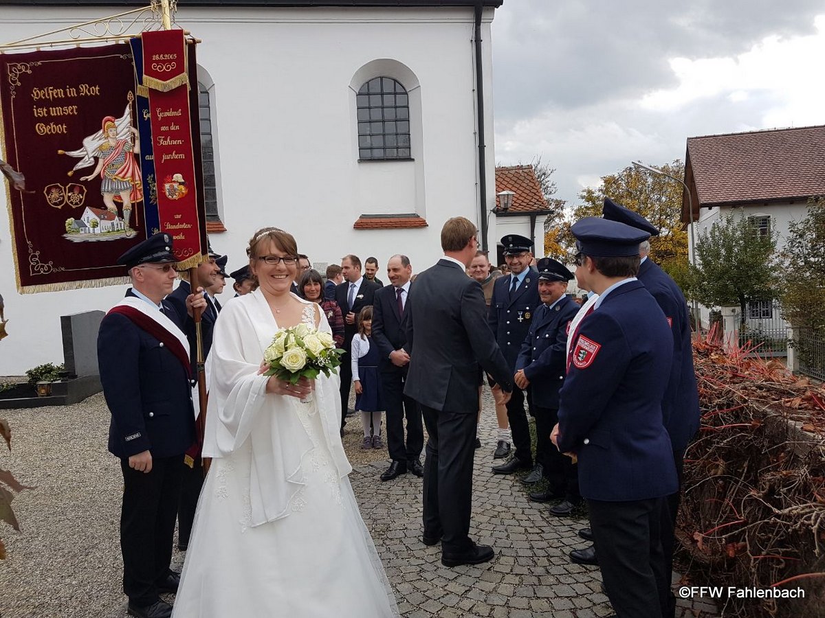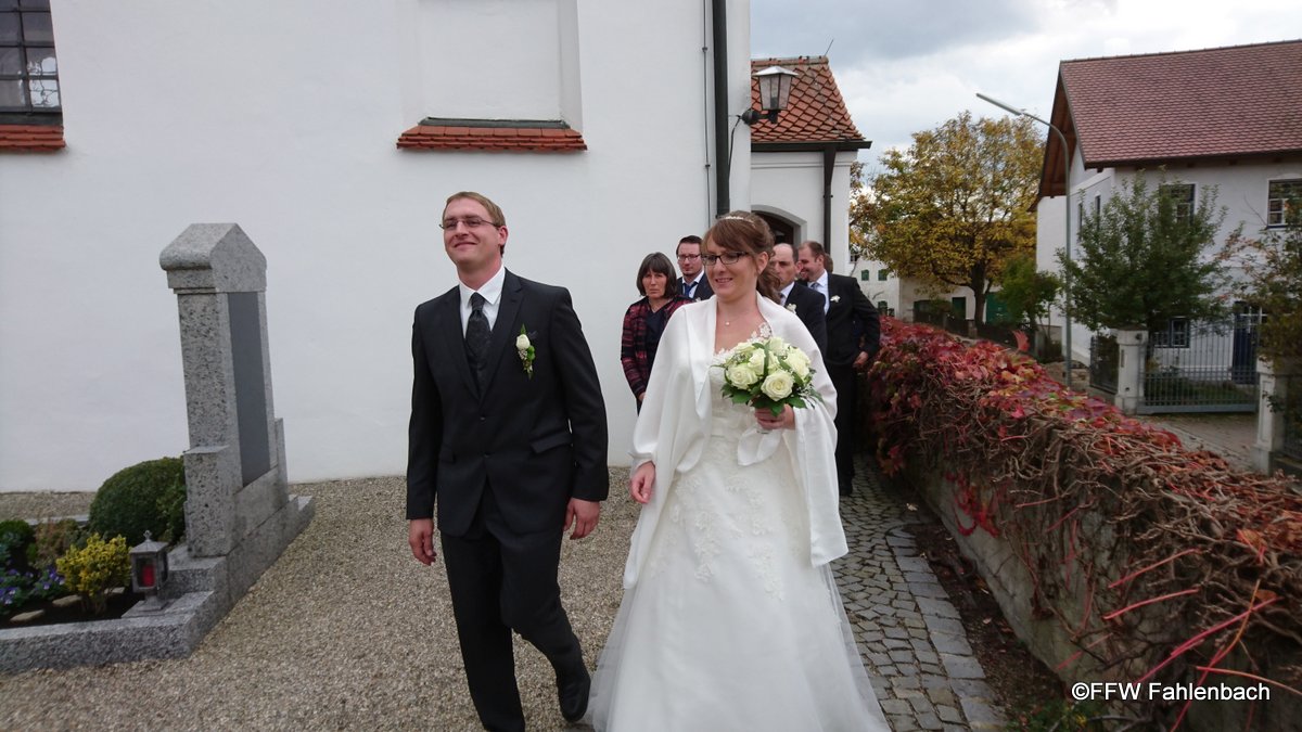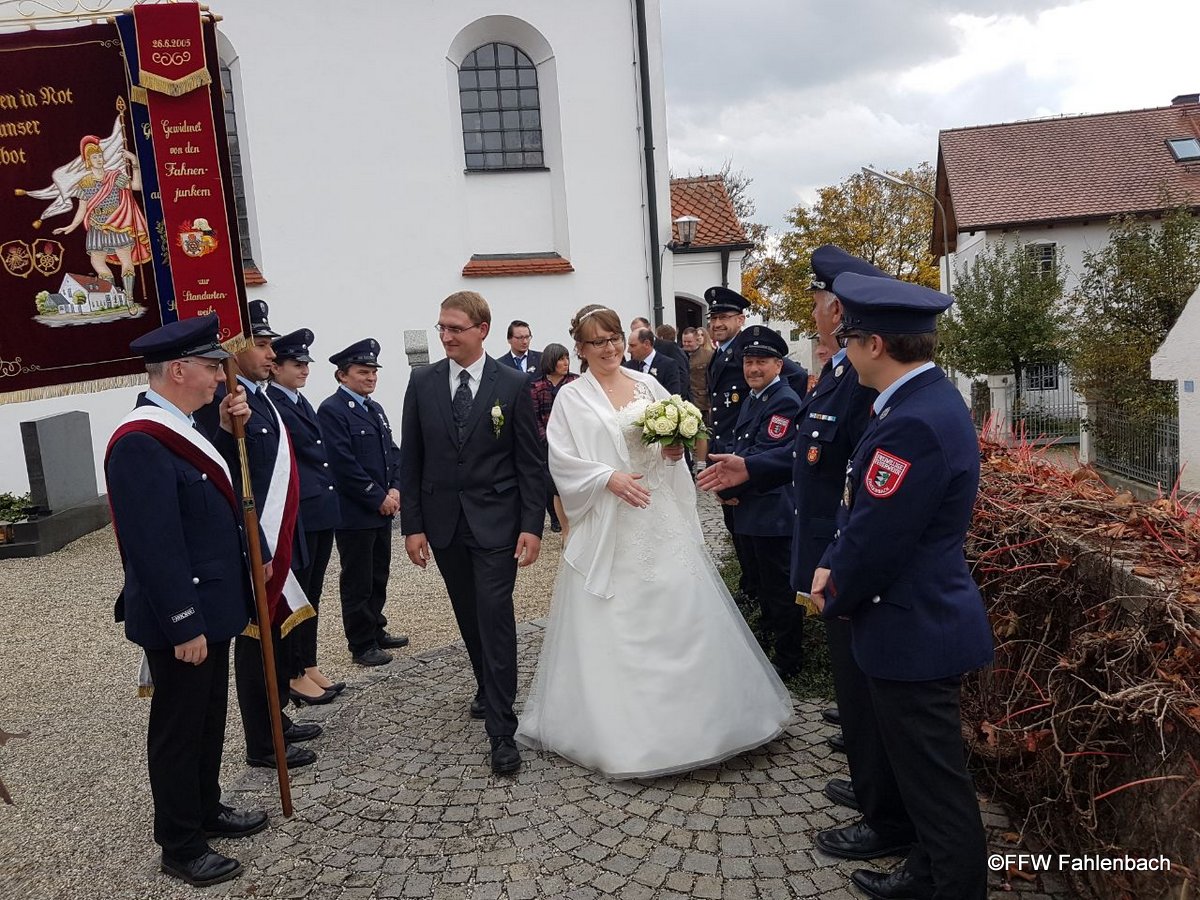 Nach der Trauung begrüßte die Freiwillige Feuerwehr Fahlenbach das frisch vermählte Paar mit einem Ehrenspalier vor der Kirche in Puch.