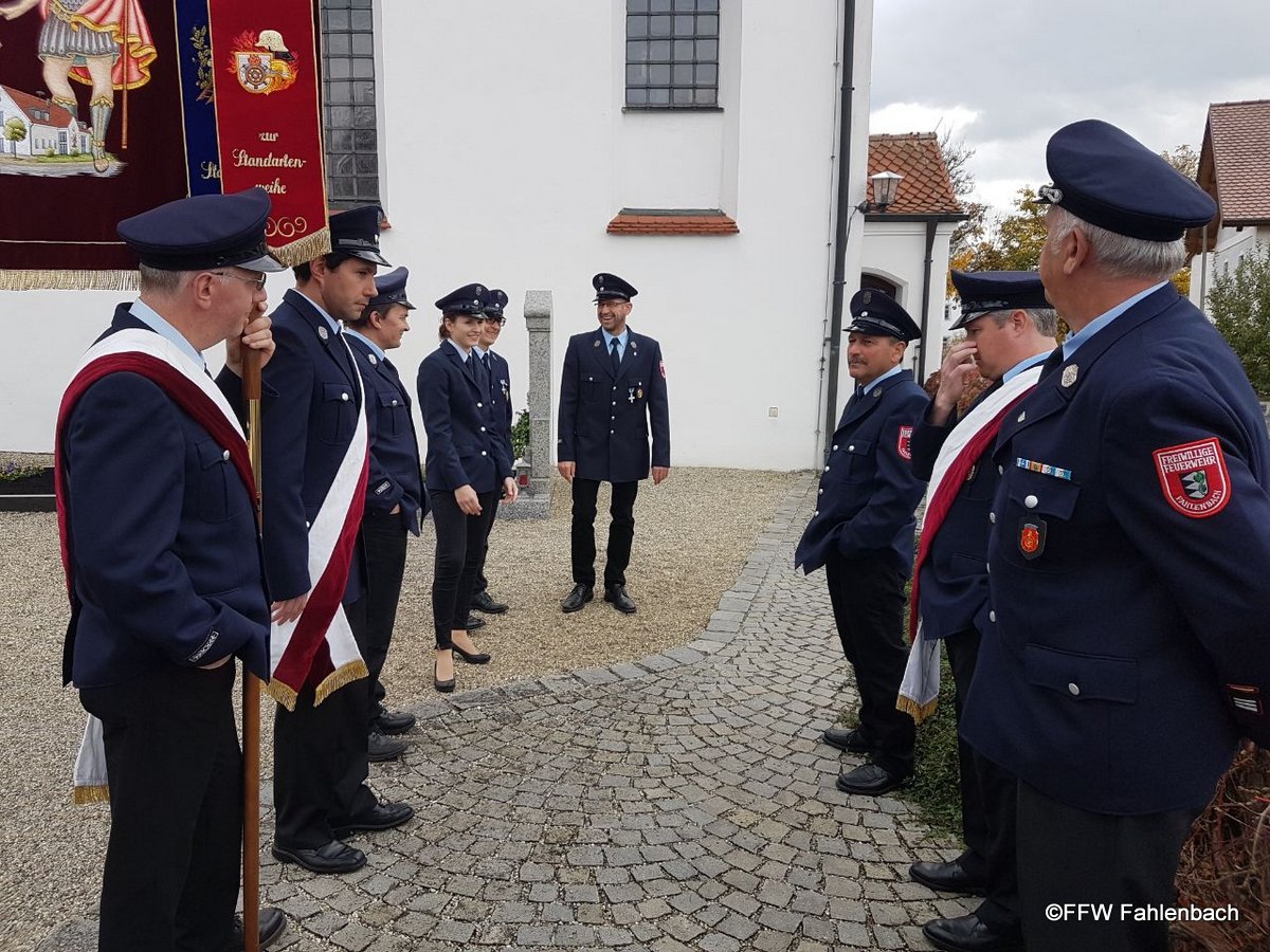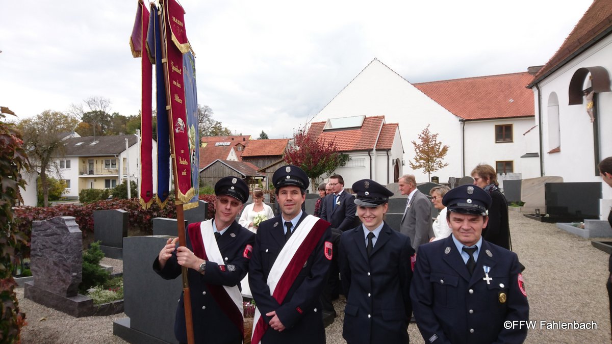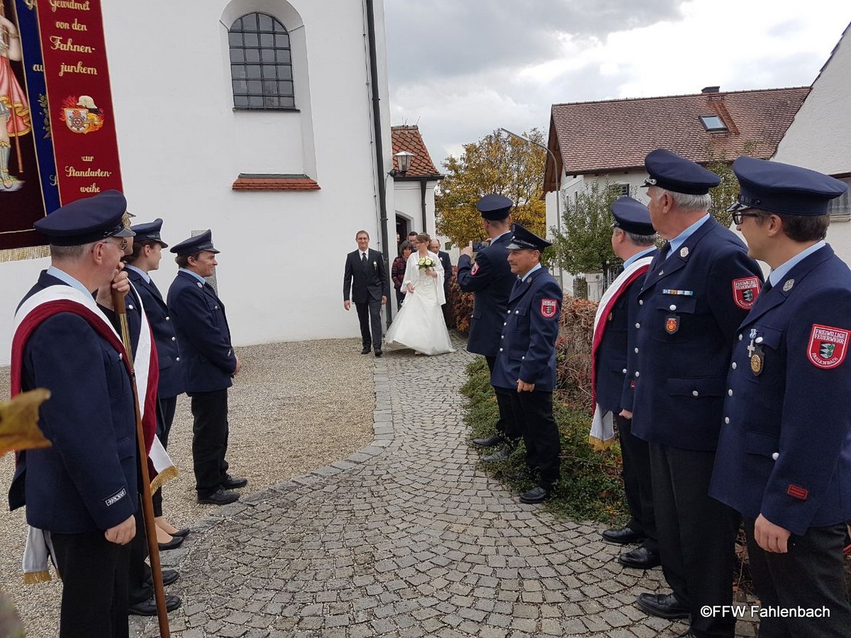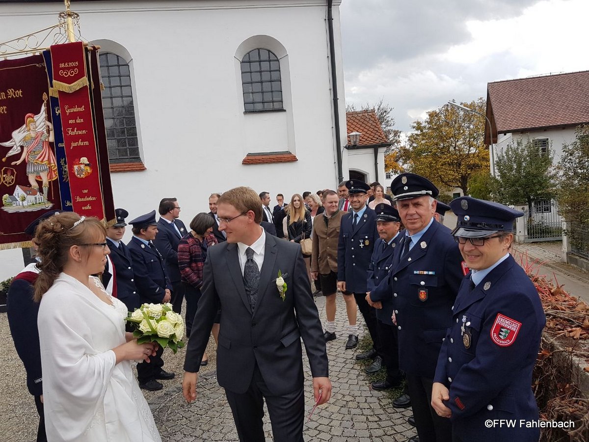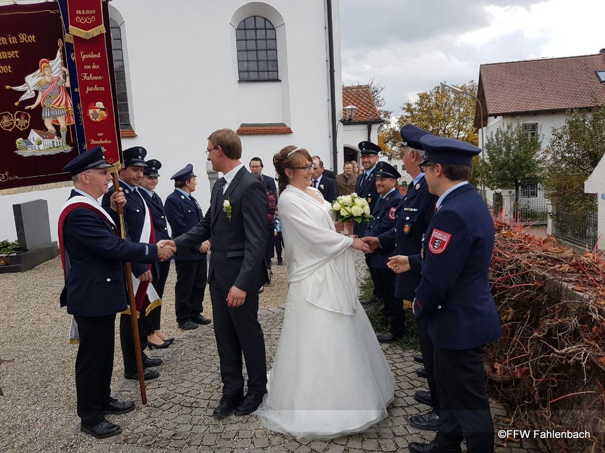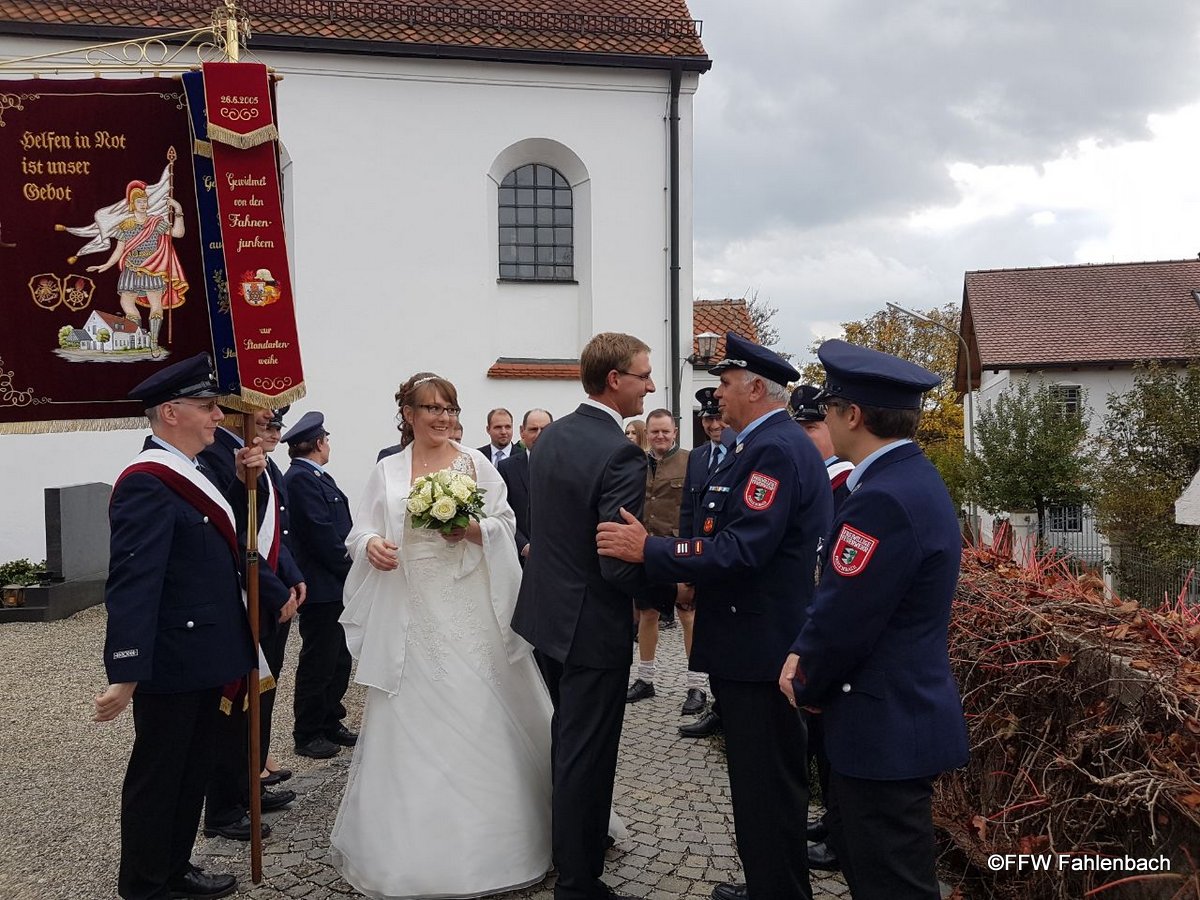 Nach der Trauung begrüßte die Freiwillige Feuerwehr Fahlenbach das frisch vermählte Paar mit einem Ehrenspalier vor der Kirche in Puch.